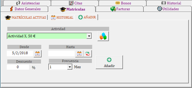 - Una matrícula en una actividad, es una mensualidad en la que inscribiremos a un cliente o socio.
