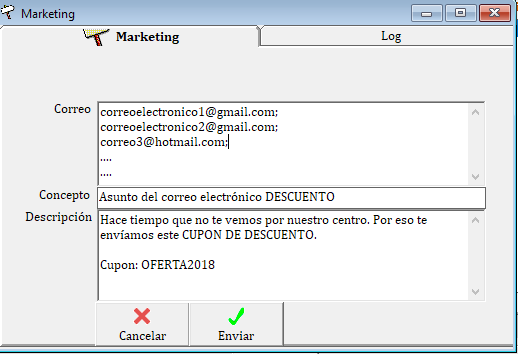 Sí ha seleccionado la opción de email, se le abrirá el siguiente formulario para completarlo. Pulse Enviar para enviar los emails a los clientes.