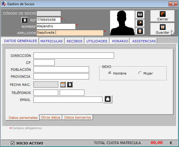 Los campos obligatorios mínimo son los que contienen el * de color rojo, es decir, los campos superiores, NIF, Nombre y Apellidos. El resto de campos es opcional.